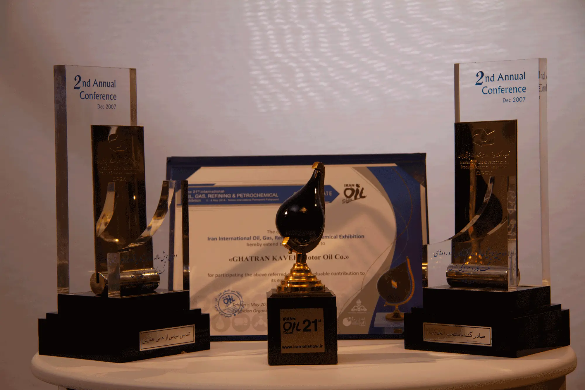 شرکت قطران کاوه، به پاس حضور فعال و اثرگذار، در دومین کنفرانس سالانه (دسامبر ۲۰۰۷) و بیست و یکمین نمایشگاه بینالمللی نفت، گاز، پالایش و پتروشیمی ایران این لوح را دریافت کرده است. این مجموعه، بیانگر نقش شرکت در معرفی توانمندیهای صنعتی کشور و توسعه همکاریها در رویدادهای تخصصی حوزه انرژی است.