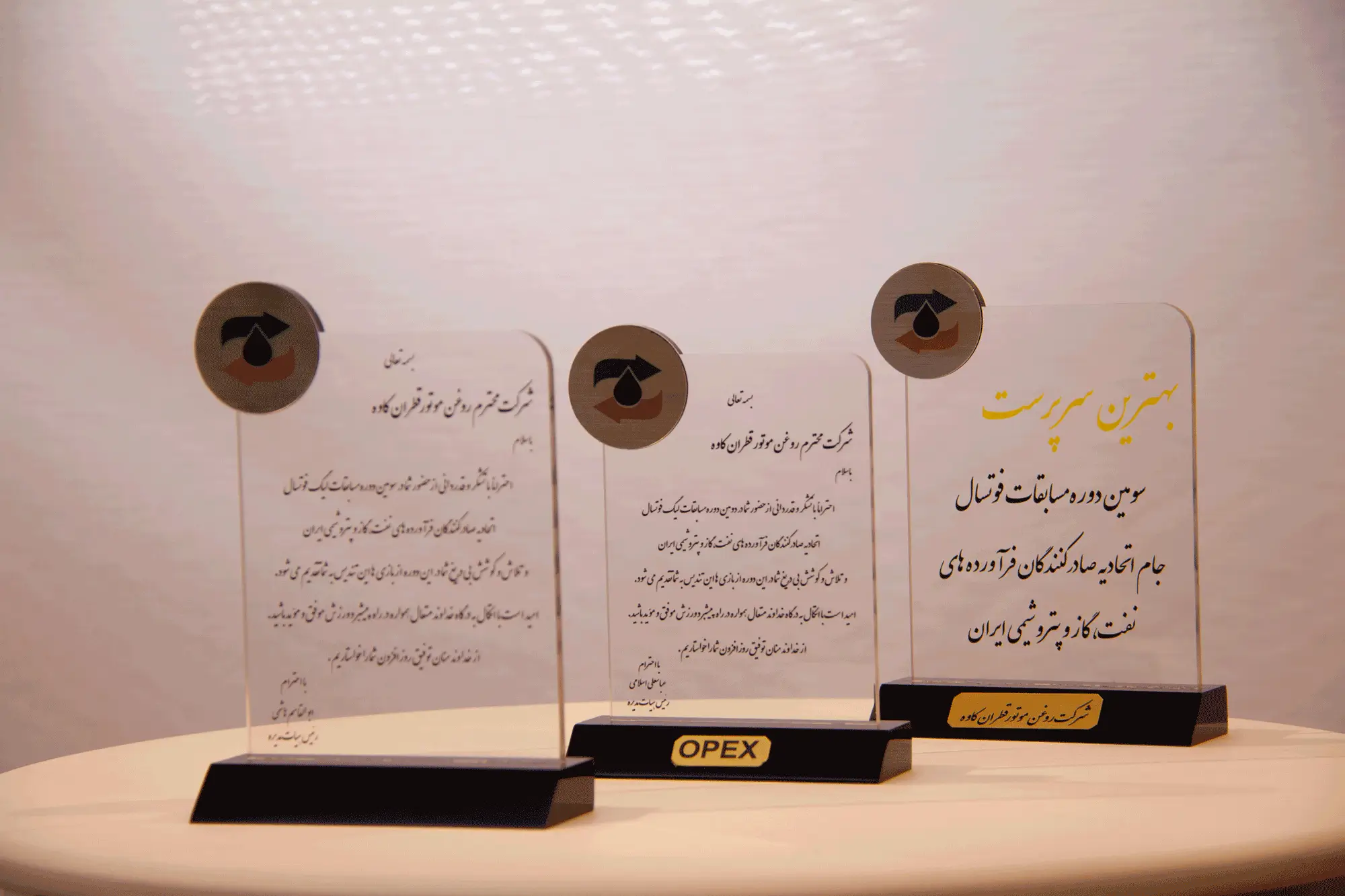 این تصویر تندیس های ورزشی شرکت روغن موتور قطران کاوه را به نمایش میگذارد؛ از جمله کسب عنوان «بهترین سرپرست» در سومین دوره مسابقات فوتبال جام اتحادیه صادرکنندگان فرآوردههای نفت، گاز و پتروشیمی ایران.