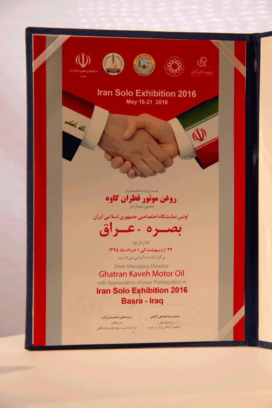 این تقدیرنامه، به مناسبت حضور شرکت روغن موتور قطران کاوه در نخستین نمایشگاه کالاهای ایرانی در سلیمانیه، اقلیم کردستان عراق (۲۲ تا ۲۶ دسامبر ۲۰۰۵) اهدا شده است. این رویداد، گامی مهم در تقویت همکاریهای اقتصادی و توسعه صادرات شرکت به بازارهای بینالمللی بود.
