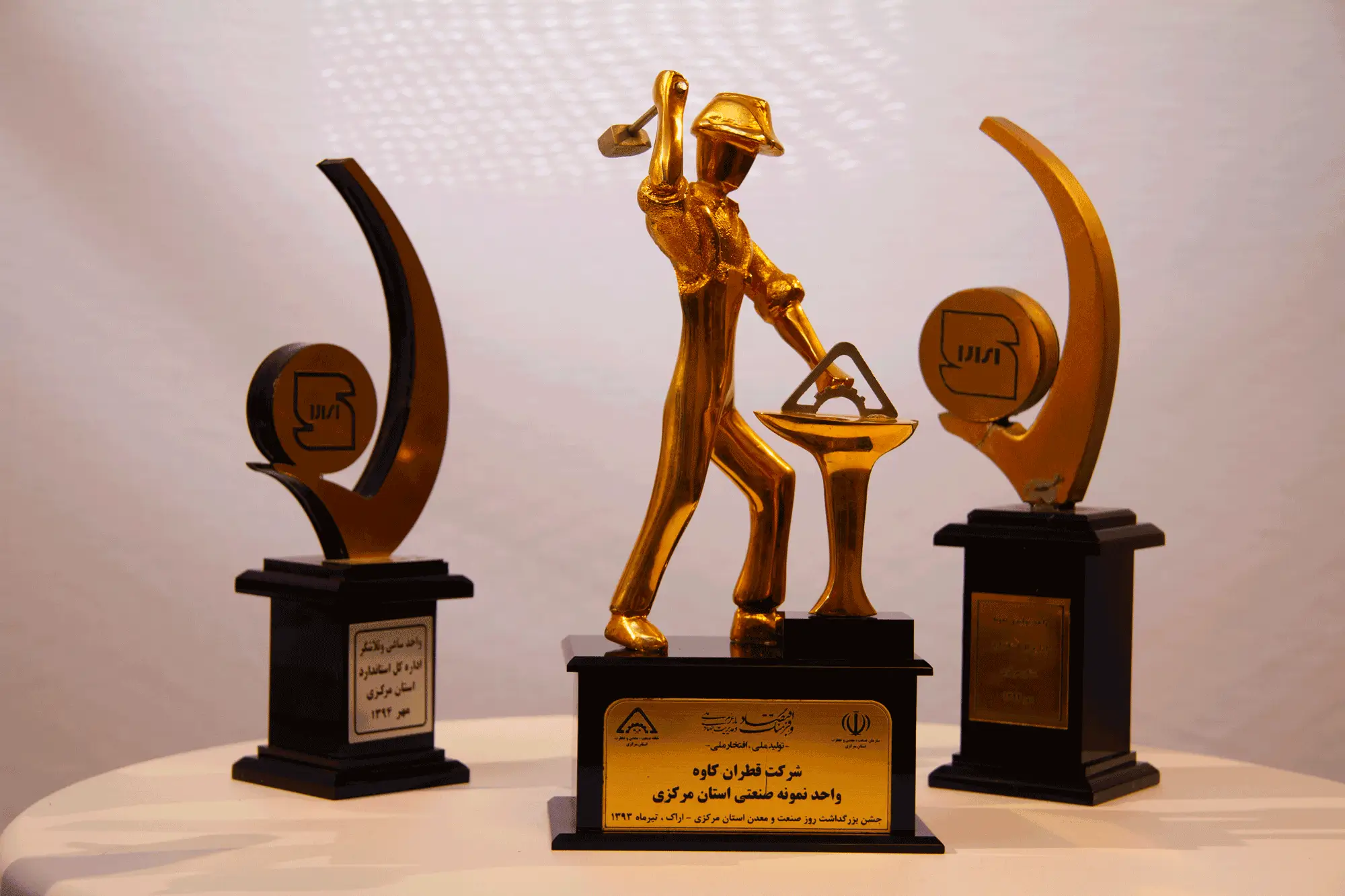 Cette image présente quelques-uns des trophées prestigieux de la société Qatran Kaveh Lubrifiants Moteur ; depuis le trophée de l’Unité industrielle exemplaire de la province du Markazi – 2014 (1393) jusqu’aux prix de Qualité et de Norme nationale d’Iran.