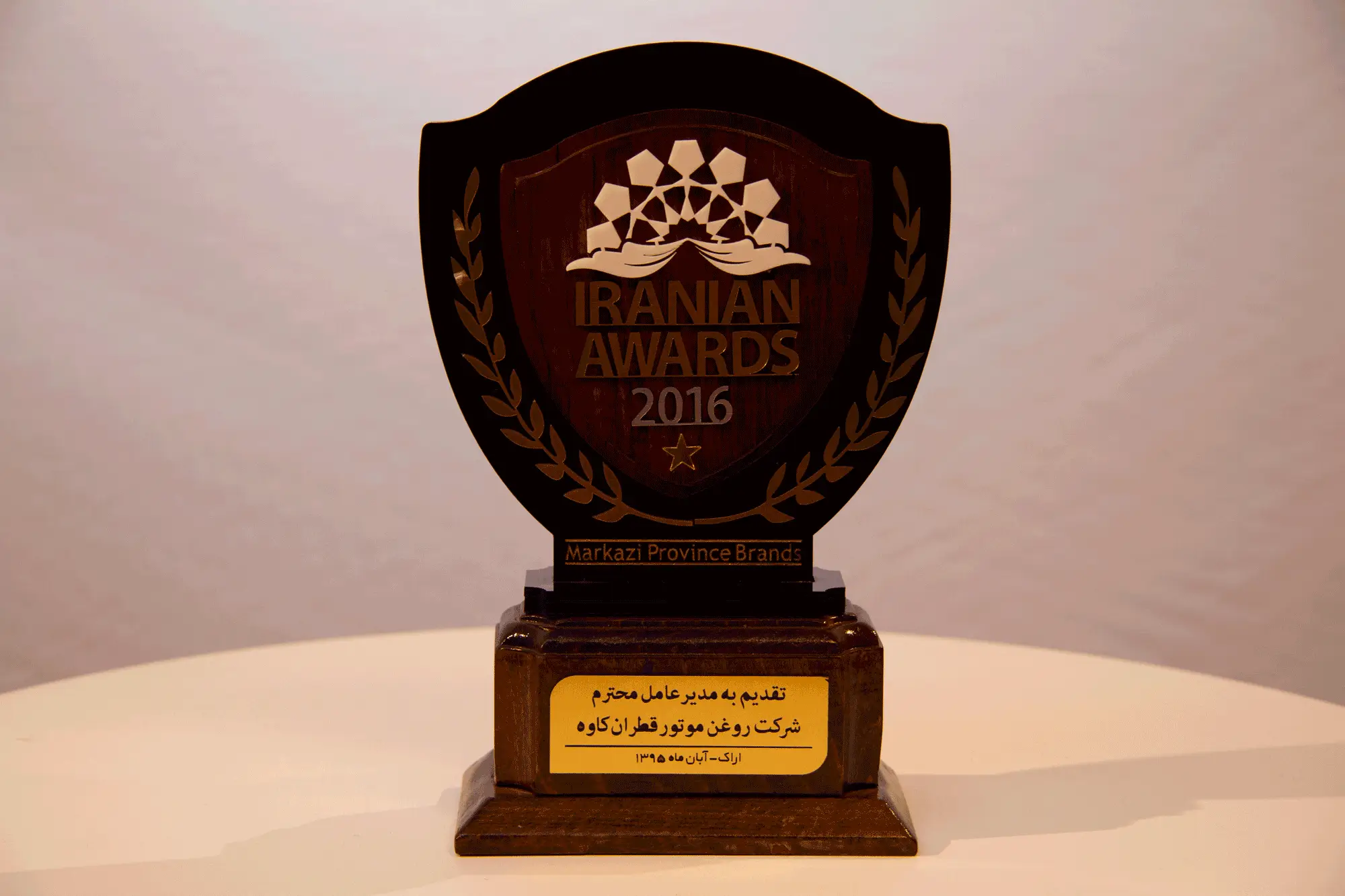Cette plaque commémorative a été décernée à la société Qatran Kaveh Lubrifiants Moteur pour sa participation officielle au premier salon exclusif de la République islamique d’Iran à Bassora – Irak (du 18 au 21 mai 2016 / 29 Ordibehesht–1 Khordad 1395).