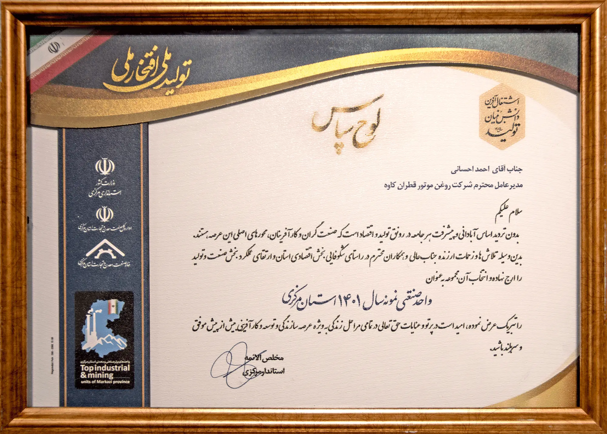 Cette plaque officielle de remerciement et d’appréciation a été décernée par le gouvernorat de la province du Markazi et par l’Organisation de l’industrie, des mines et du commerce de cette province.